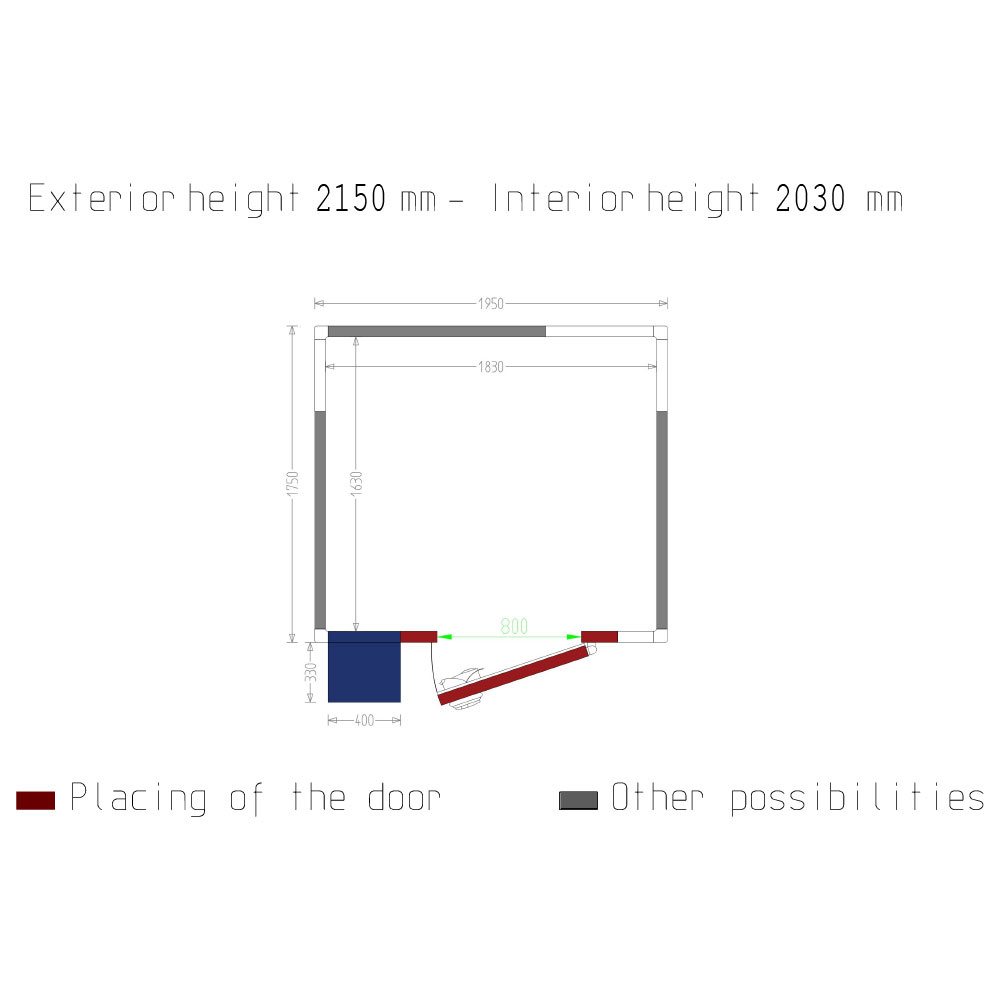 • Porte passage utile 800 x h 1900 mm (positionnement de la porte au choix, sur les 4 côtés).