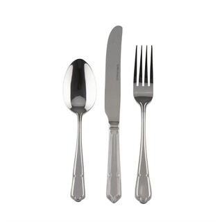 Comprend: 1 couteau de table 238mm, 1 fourchette de table 202mm et 1 cuillère à dessert 180mm. En acier inoxydable 18/0 poli avec une bordure arrondie élégante. Vendus par douze. Bout du manche élégant, de forme courbée. Manche arrondi orné