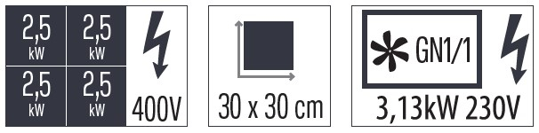 - Puissance : 4 x 2 500 W / 400 V + 3 100 W / 230 V