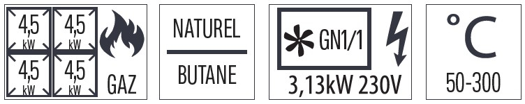 - Puissance : 4 x 4 500 W gaz + 3 100 W / 230 V