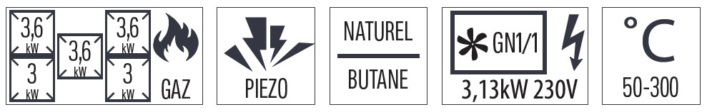 - Puissance : 3 x 3 600 w + 2 x 3 000 w gaz + 3 100 w / 230 v