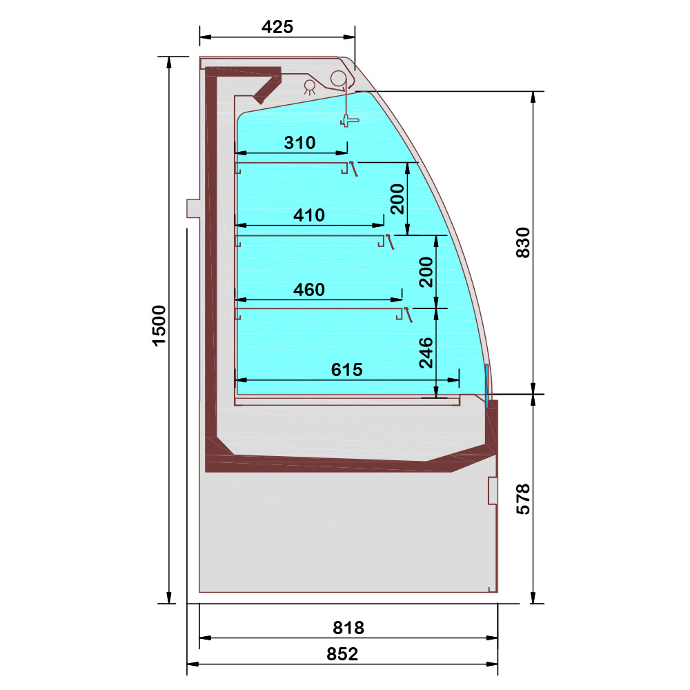 - Profondeur exposition 615 mm, hauteur 830 mm