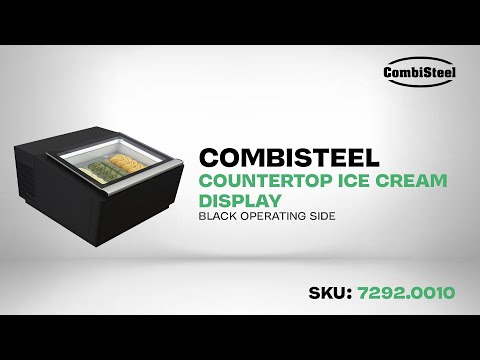 Modèle de table vitrine à creme glacée noir s'ouvre du côté fonctionnement (7292.0010) - COMBISTEEL. Caractéristiques principales : Largeur (mm): 670, Profondeur (mm): 750, Hauteur (mm): 375, Tension (Volt): 230.