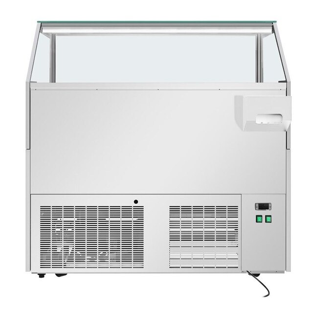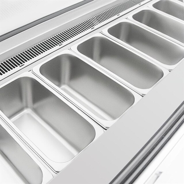 Au-dessus, la zone d'exposition en verre permet aux clients de voir et de choisir facilement parmi vos délicieuses offres. Un éclairage LED vif éclaire vos glaces, améliorant la visibilité et mettant en valeur les couleurs riches de vos délices glacés. À l'arrière, des portes coulissantes pratiques permettent d'économiser de l'énergie tout en offrant un accès facile, facilitant le réapprovisionnement et le service.